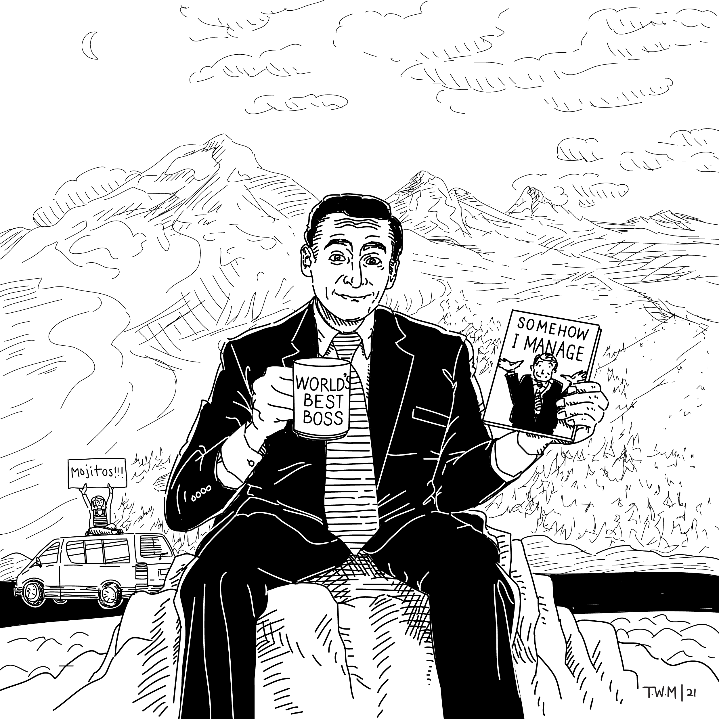 Michael sipped from his mug and marveled at the majestic mountains while mulling over his monograph. As to the mystery of how he managed to make it to the mountaintop, it might have been Meredith and her minivan. Anyone want mojitos??